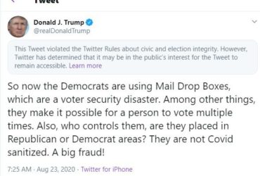 Twitter dice que el tuit del presidente Trump sobre buzones de correo violó sus reglas pero permanecerá visible